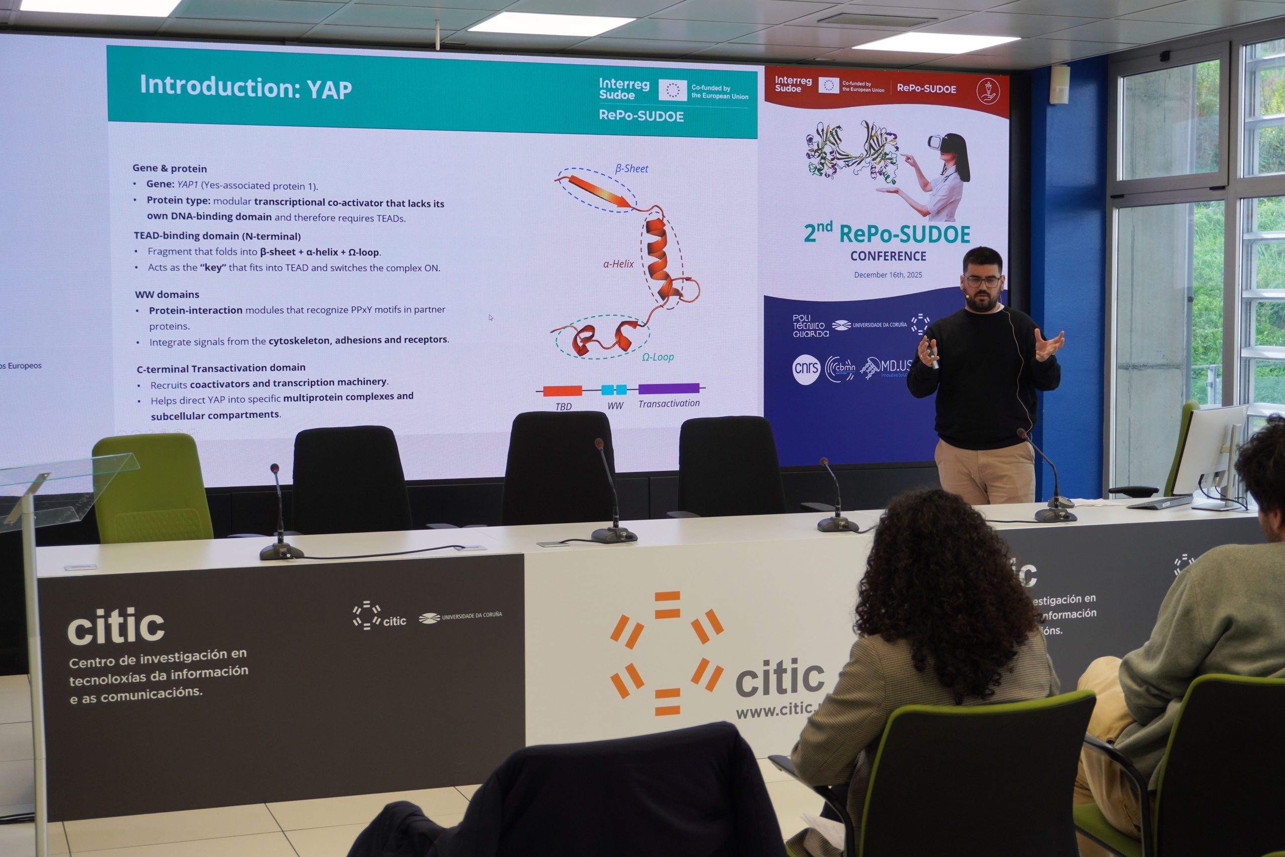 El CITIC acogió hoy la jornada técnica de la Segunda Conferencia del proyecto europeo RePo-SUDOE, liderado en la UDC por el investigador Carlos Fernández Lozano. Se trata de un encuentro que ha puesto el foco en el papel de la tecnología en la búsqueda de nuevas aplicaciones terapéuticas para fármacos ya existentes.