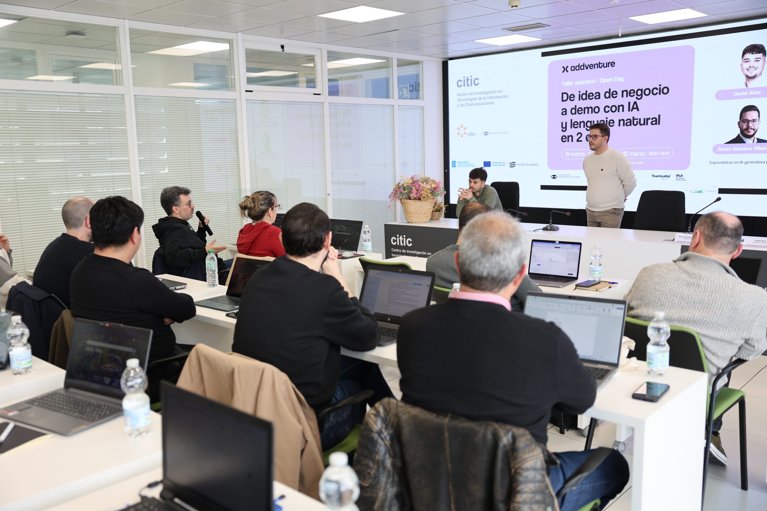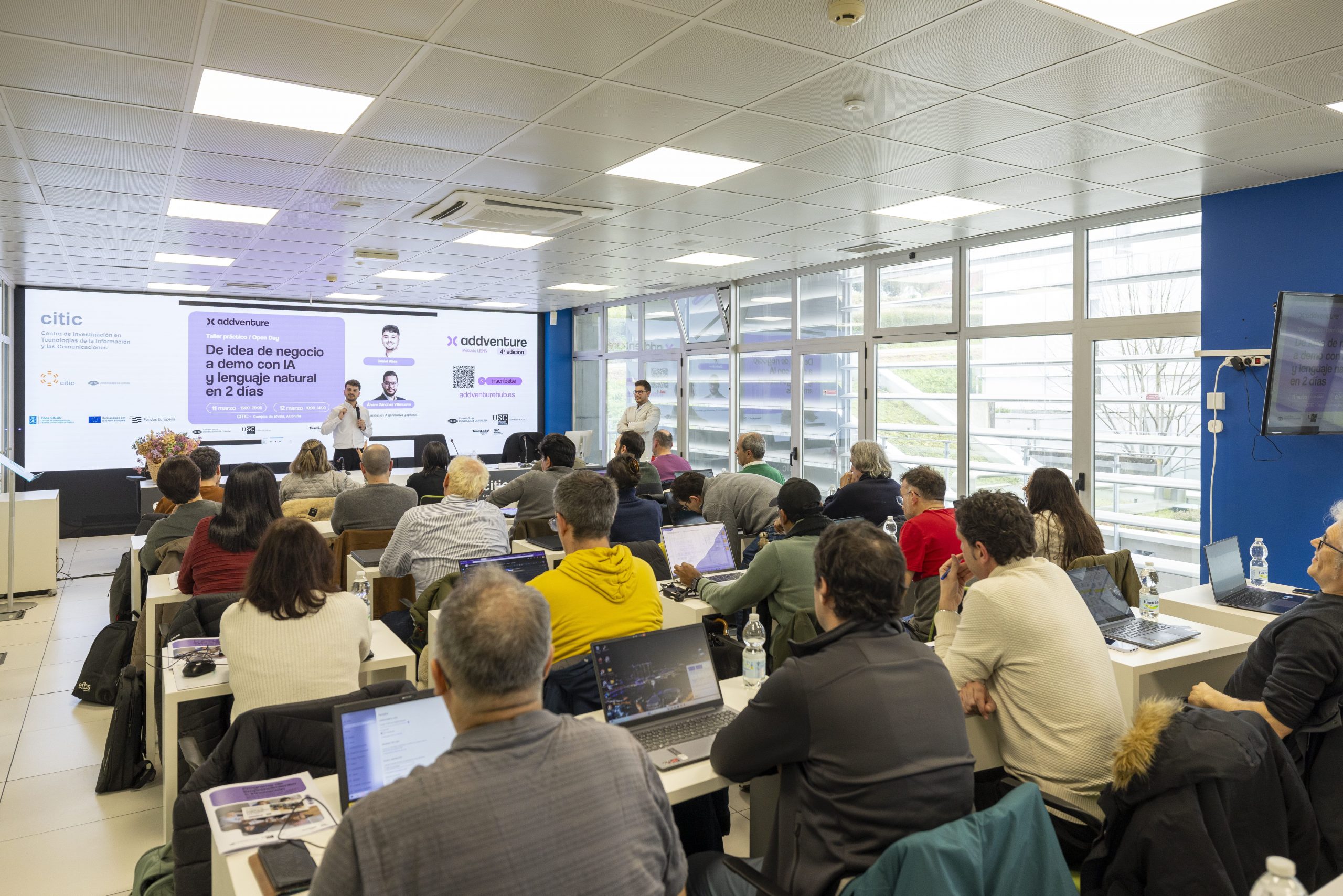 El Centro de Investigación en Tecnologías de la Información y las Comunicaciones (CITIC) de la Universidade da Coruña acogió estos días los talleres del programa de emprendimiento AddVenture, una actividad práctica organizada por los Consellos Sociais de la Universidade da Coruña y de la Universidade de Santiago de Compostela, que tiene como objetivo ayudar a las personas participantes a transformar sus ideas de negocio en prototipos funcionales empleando inteligencia artificial y lenguaje natural.