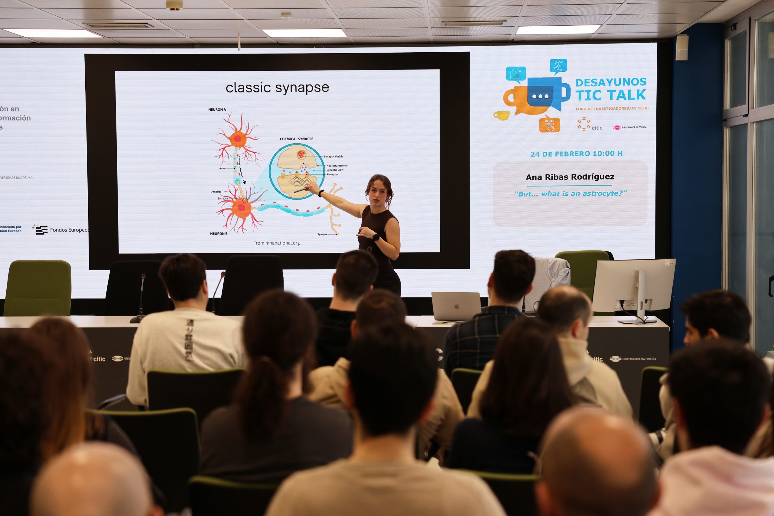 O CITIC acolleu este martes unha nova edición dos AlmorzosTIC Talk. Nesta ocasión, a investigadora Ana Ribas foi a encargada de impartir a charla titulada “But… what is an astrocyte?”, centrada na conexión entre neurociencia e intelixencia artificial.