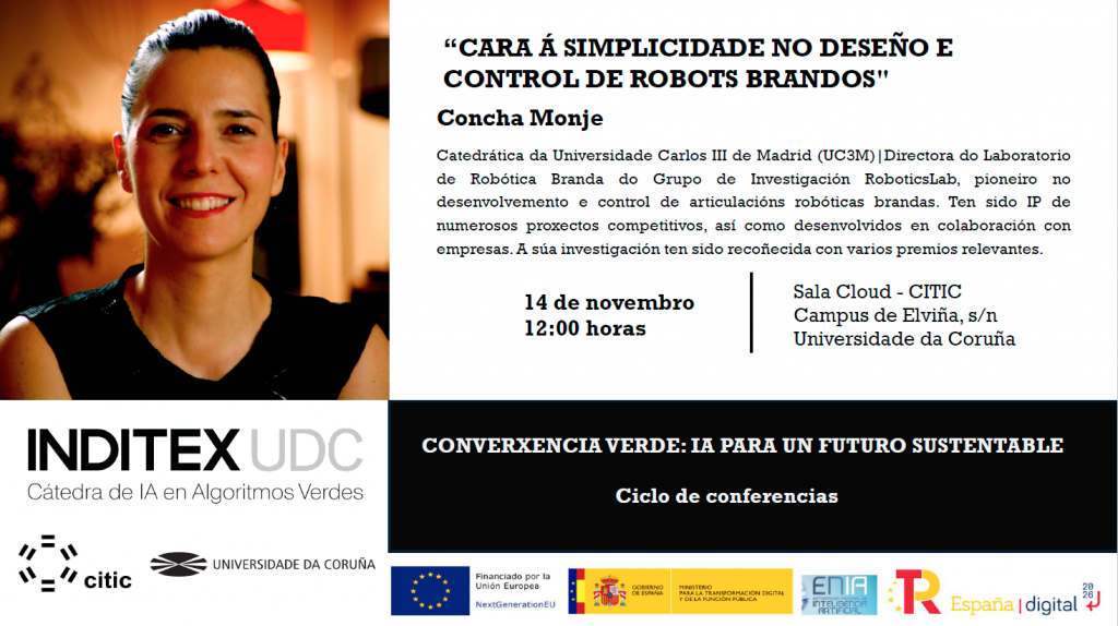 Nesta ocasión, contarase coa participación de Concha Monje, catedrática da Universidade Carlos III de Madrid (UC3M) e directora do Laboratorio de Robótica Branda do grupo RoboticsLab, pioneiro no desenvolvemento e control de articulacións robóticas brandas. A súa traxectoria investigadora, recoñecida con numerosos premios, combina o rigor científico coa aplicación práctica en colaboración con empresas do sector tecnolóxico.